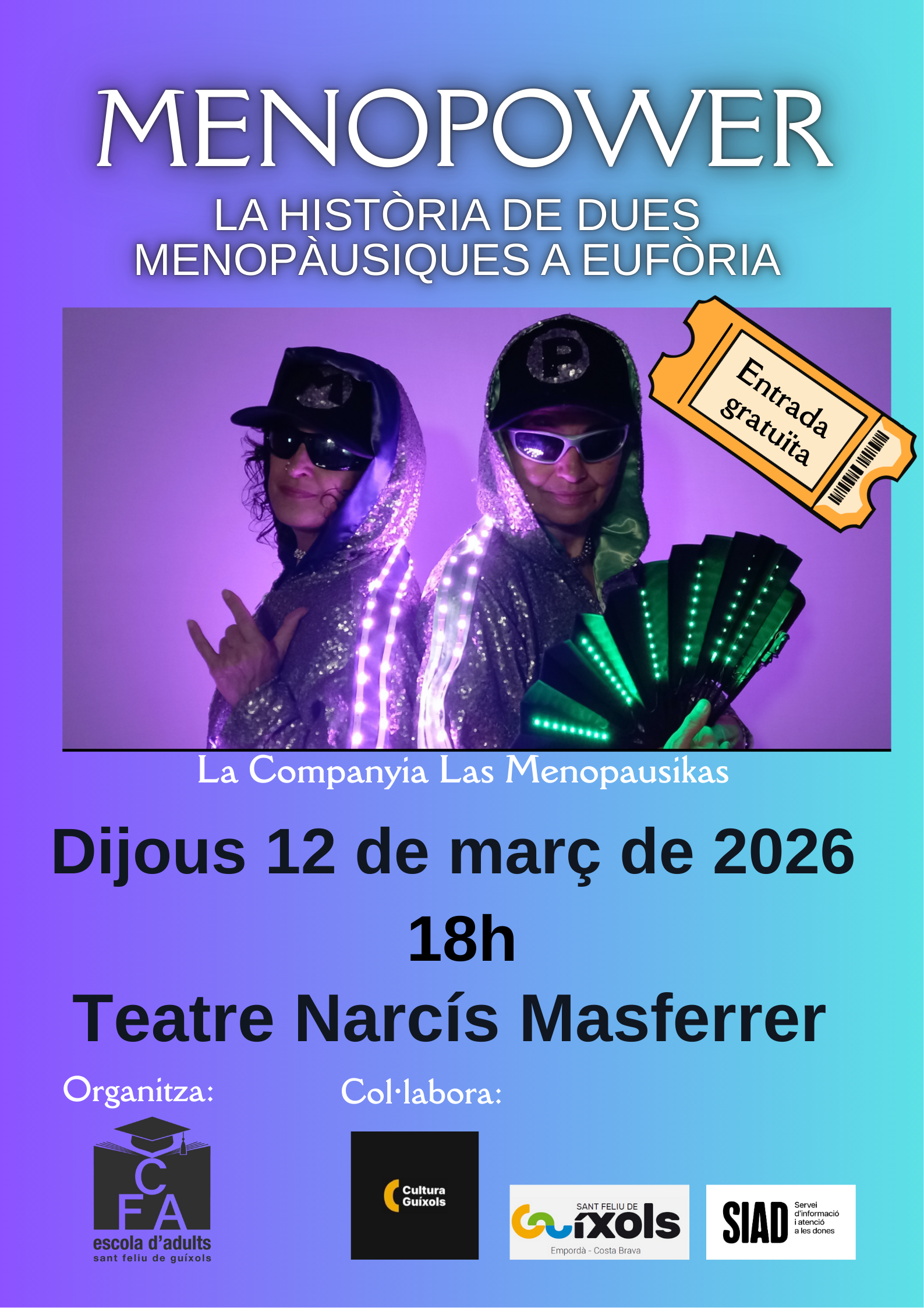 MENOPOWER és la història de la Bollo i laSòviet, dues amigues feministes de més de 50anys que conversen sobre les seves vivènciesclimatèriques. La trama passa enmig de laproposta d’una d’elles de presentar-se a unconcurs de cant de la tele. Un pretext perfecteper parlar de la menopausa i donarinformacions i consells. L’espectacle exposa ladiferència de viure la menopausa en funciódels privilegis de classe i d’opció sexual ienfatitza la necessitat que les lluites siguininterseccionals.